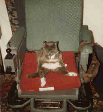 such as adjustable leg rests and a headrest. My cat circe also thinks its comfortable to sit on! One of the thins which I do from time to time is man a stand at various exhibitions, which the Coventry Council of Disabled has a stand. On one such exhibition, in Coventry, which I helped to organise, for the wheelchair users of Coventry, I was approached by one of the wheelchair salesmen, who was interested in my Squirell. He told me, that he had one like it which he had taken in part exchange but could not find anyone to buy with the spares situation being non existent. I did a deal to buy it off him very cheaply, trading in some parts which I had kept form my very first electric wheelchair, which were of more use to him. Thus it was that I acquired my fourth squirrel to date. I only live in a one bedroomed flat so you can imagine the difficulty I have with keeping them, but it is better to be safe than sorry, because the controller on one of them did start acting erratically and had to be replaced from another. I still like the wooden mark II best of all and would