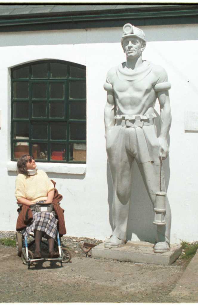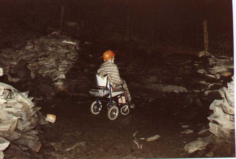 Two pictures taken over the following years in South Wales. The first at the Big Pit Coalmine which she descended in her wheelchair and the second near the Dolocauthi Gold mines | |