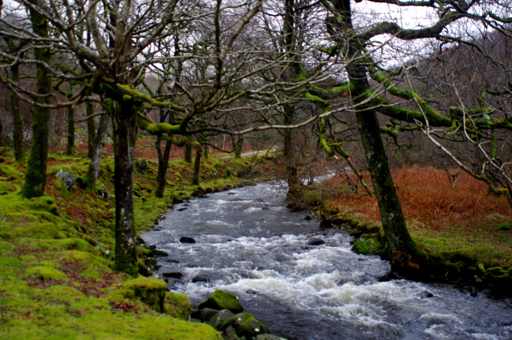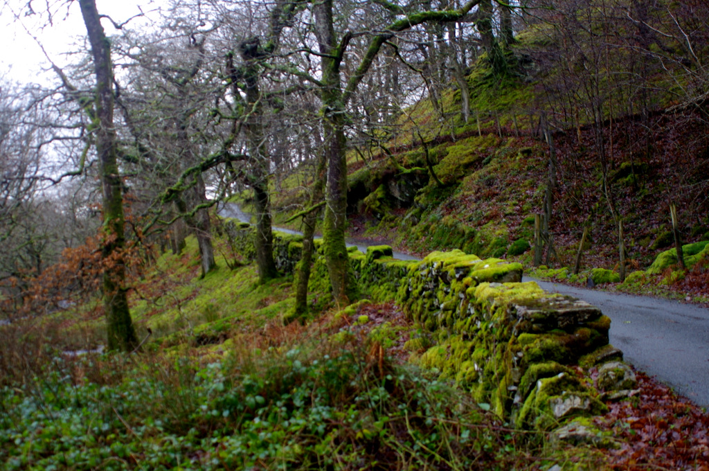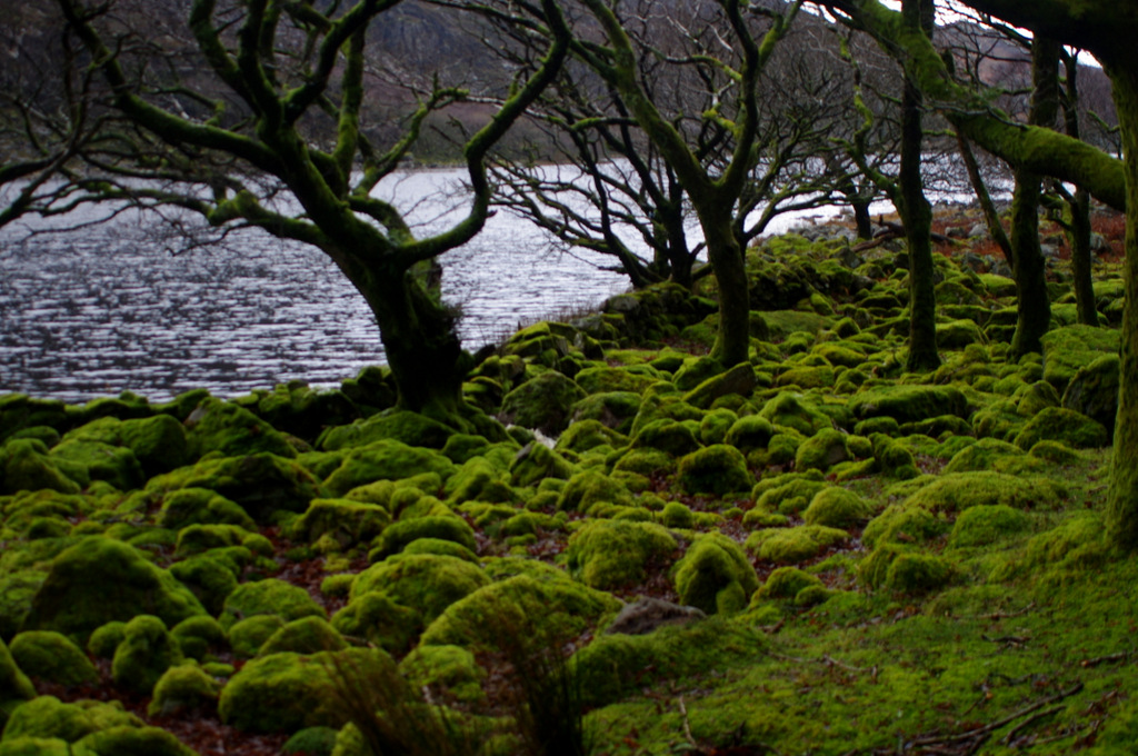 Moss has completely colonised the rocks leaving everything an eery green |